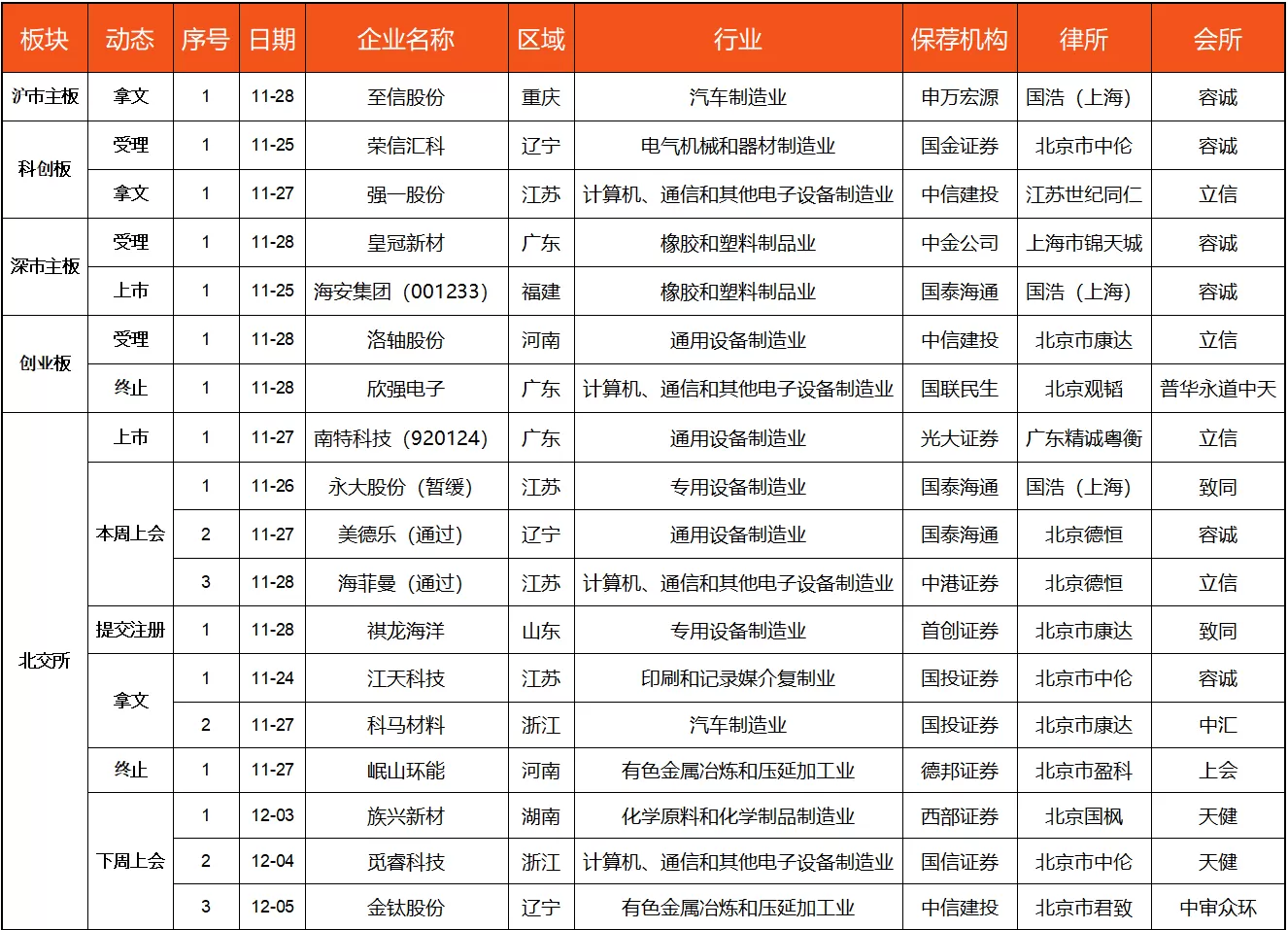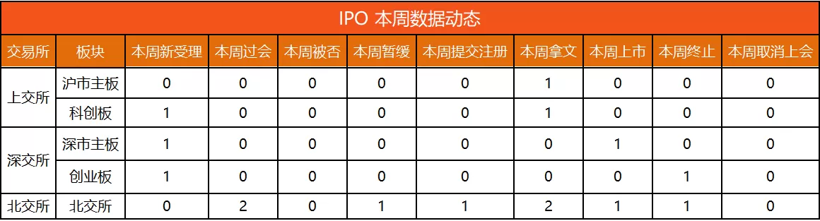 览富财经网统计,11月23日-11月29日,3家企业受理、3家企业首发上会,2家获通过,1家暂缓审议、1家企业提交注册、4家企业顺利拿到批文、2家企业上市、2家企业终止、下周上会企业3家。