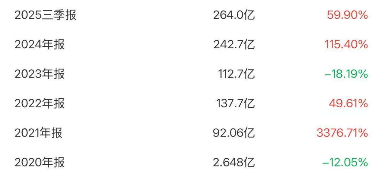 数据显示,2021年至2025年前三季度,公司分别实现营收92.06亿元、137.70亿元、112.70亿元、242.70亿元、264.00亿元,分别增长3376.71%、49.61%、-18.19%、115.40%、59.90%,整体规模从原来的不到3亿元,跃升至超过260亿元,可谓惊人。