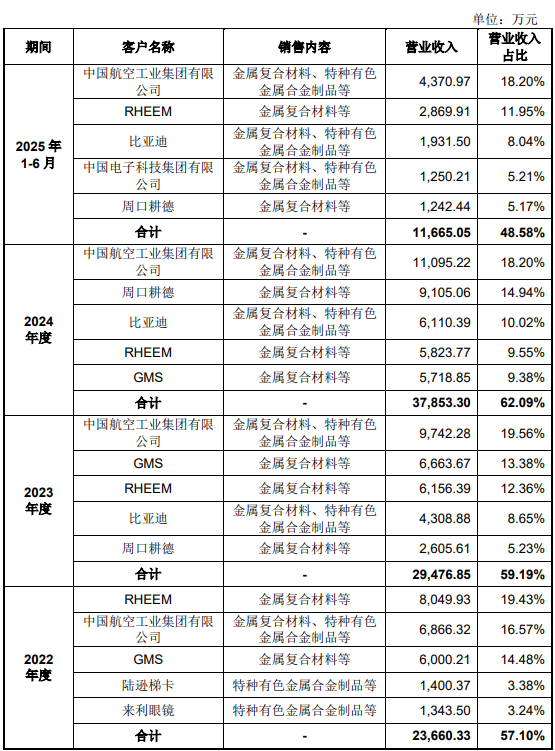 前五大客户:2022 年、2023 年、2024 年和 2025 年 1-6 月,报告期内,公司向前五大客户的销售占比分别为 57.10%、 59.19%、62.09%、48.58%。