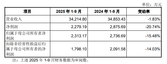 2025 年 1-9 月公司实现营业收入 34,214.80 万元,整体较去年同期基本保 持稳定;2025 年 1-9 月公司净利润 2,279.19 万元,较去年同期减少 20.74%。
