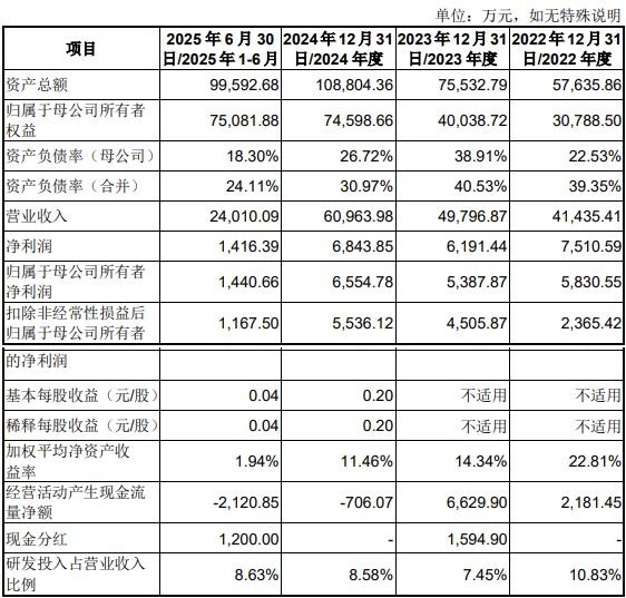 2022年、2023年、2024年和2025年1—6月公司实现营业收入分别为 41,435.41万元、49,796.87万元、 60,963.98万元、24,010.09万元,扣非归母净利润分别为2,365.42万元、 4,505.87万元、5,536.12万元、1,167.50万元。2025年1-6月,公司营业收入同比减少 455.73万元、下降 1.86%,扣非归母净利润同比减少 647.35 万元、下降 35.67%。