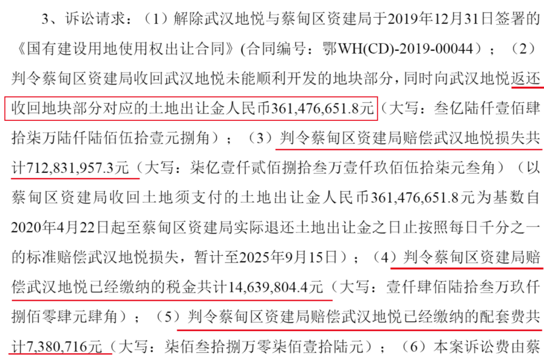 具体而言,武汉地悦诉求,蔡甸区资建局收回武汉地悦未能顺利开发的地块部分,同时返还收回地块部分对应的土地出让金3.61亿元。