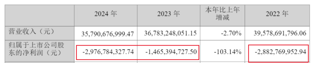 自此之后,大悦城更是一发不可收拾。2023年和2024年,大悦城的营收一路下滑,归母净利润又分别亏损了14.65亿元、29.77亿元。