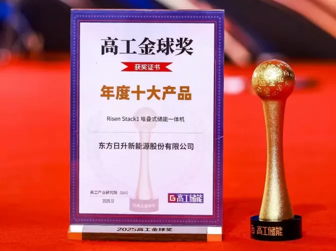 12月11日,2025高工储能金球奖颁奖典礼在深圳举行,东方日升工商业堆叠式储能一体机斩获高工金球奖2025年度十大产品奖。作为东方日升上半年推出的储能新品,此次获奖不仅是对产品硬核实力的高度认可,更彰显了公司在储能领域的技术积淀与行业影响力。