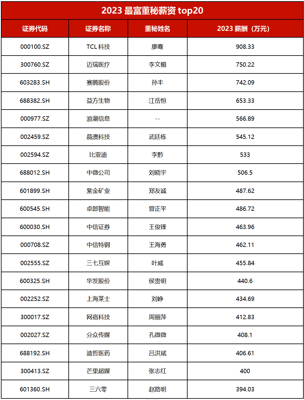 然而,放眼全国,浙江董秘可谓是“小巫见大巫”。2023年tcl科技董秘廖骞以908.33万元年薪成为“最富董秘”。tcl科技2023年实现归母净利润22.15亿元,同比增长747.60%。