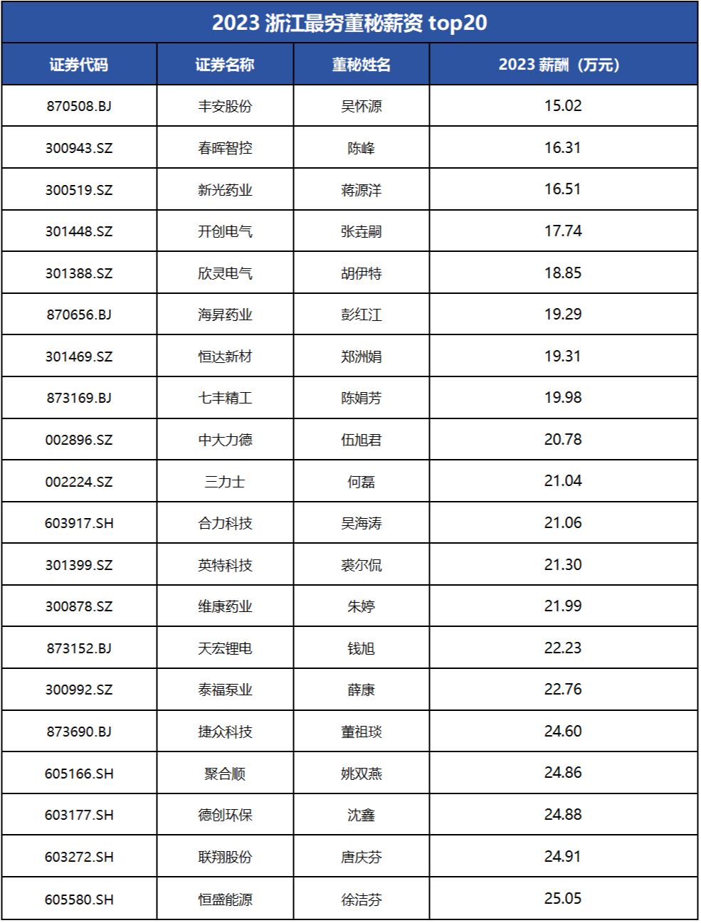 有最富董秘,就有最穷董秘!丰安股份的吴怀源以15.02万元“登顶”2023浙江最穷董秘榜!丰安股份2023年实现营业总收入9744.08万元,同比下降34.01%;归母净利润2696.41万元,同比下降21.83%。