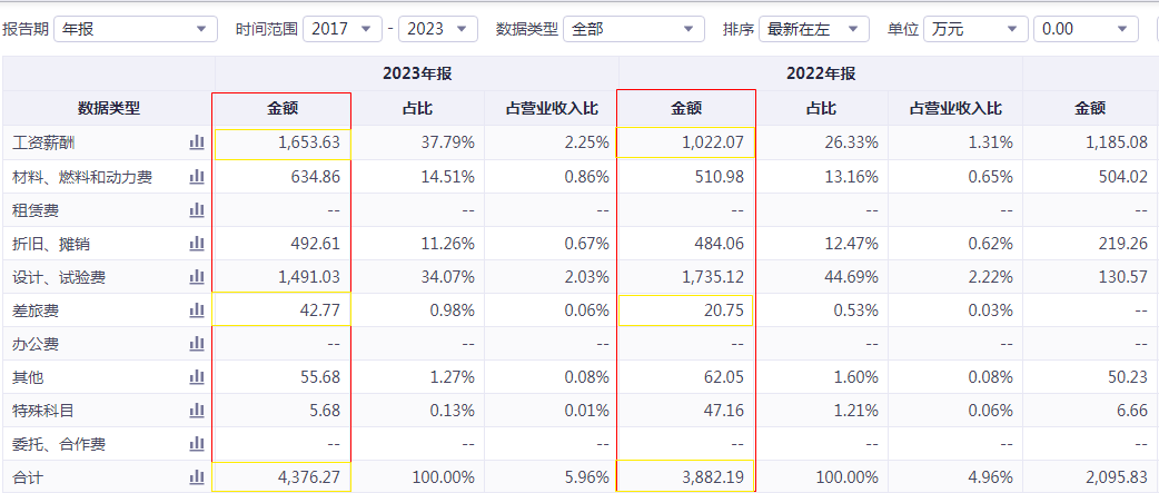 从研发人员学历结构看,硕士、本科下降幅度最大。然而,研发人员整体的工资薪酬却上涨了600多万,差旅费用还翻了倍。