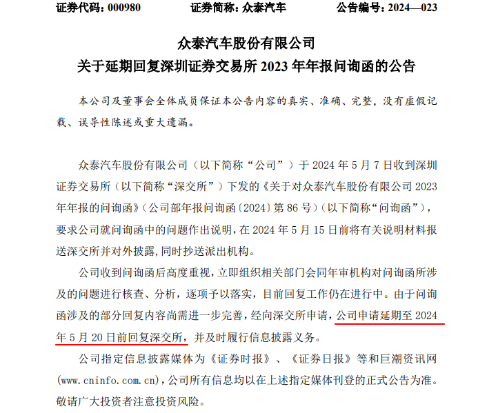 随后,众泰汽车公告称,公司申请延期至 2024年 5 月 20 日前回复深交所,并及时履行信息披露义务。