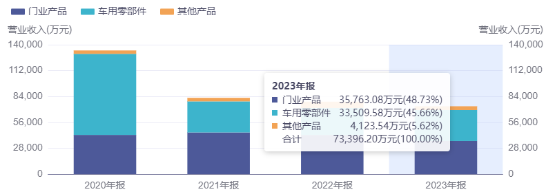 事实上,自宣布破产重整之后,汽车相关业务已不是众泰汽车最主要的收入来源。2023年,门业产品收入占比为48.73%,汽车零配件产品占比为45.66%。