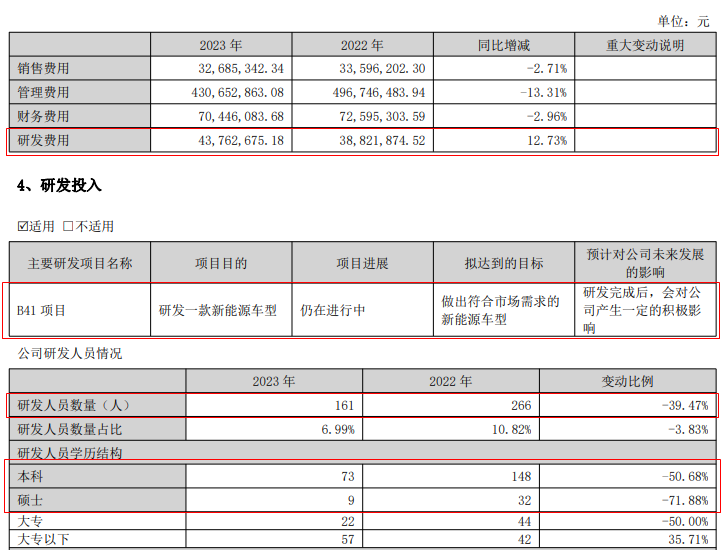 以研发人员为例,截止2022年末,众泰汽车拥有研发人员266人,较上年同期34人猛增近7倍。然而,截止2023年末,众泰汽车研发人员为161人,同比下降近四成。