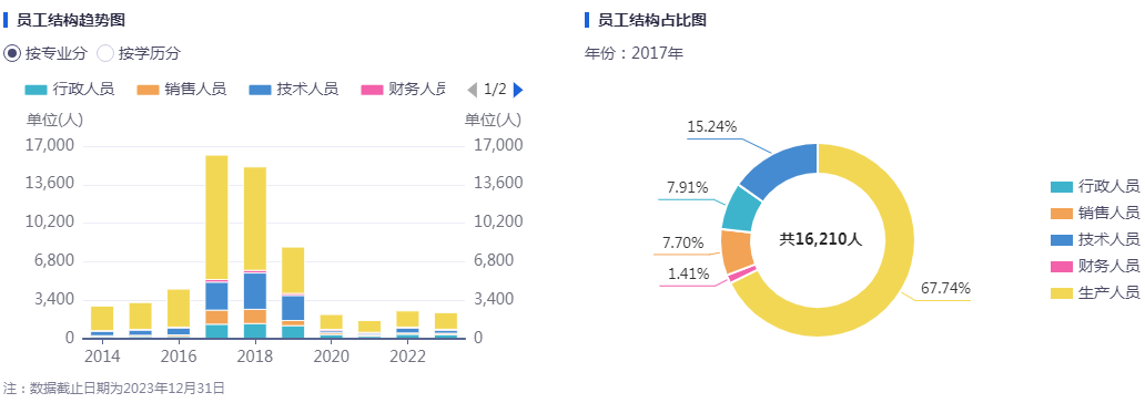 不仅管理层频繁动荡,众泰汽车的员工数量同样大幅减少。截止2023年末,公司在职员工数量为2304人,较去年末的2459人减少了155人。